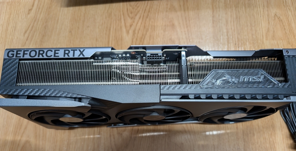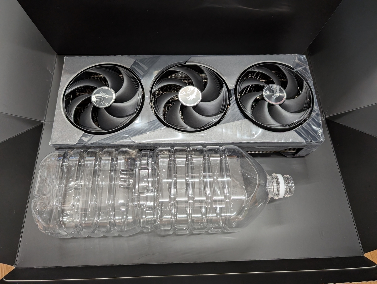 今まで使っていたRTX4090(ZOTAC TRINITY OC)と比べると、思ったほど大きさに差がないが重さがだいぶ違う(1.96kg vs 2.41kg)。身近なものと比較すると2Lペットボトルよりもデカく重いのだが、これは果たしてマザボに刺していいものなのだろうか。