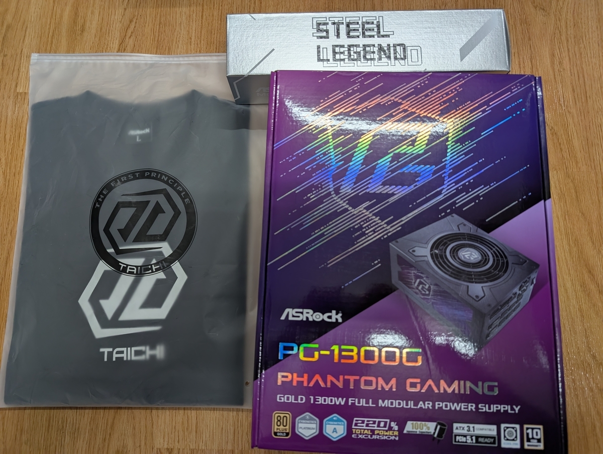 もともと電源としてはCoolerMaster MWE GOLD 1250 V2を持っていたのだが、あいにくATX3.0の電源であるため、万全を期すため(万が一故障したときにケチをつけられて保証受けられないみたいなことにならないように)、ATX3.1規格かつ12V-2x6コネクタに温度センサーがついていて加熱時に電源供給を遮断する機能を搭載したAsrockのPG-1300Gを購入した。 ちょうど日本橋のパソコン工房に在庫があったため店頭購入したのだが、Steel LegendマウスパッドとTaichi Tシャツがおまけでついてきた。