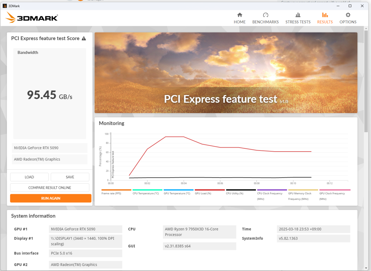 また、PCIe5.0x16でリンクしている疑惑の確認のため、PCIe Feature Testも実施。96.37GB/sというPCIe4.0x16を超える速度が出ているので、本当にPCIe5.0x16でリンクしている?のかもしれません。やっぱこのマザボちょっとおかしい気もする。
