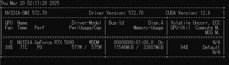 こちらのモデルは24GBのVRAMでもモデルが乗り切るものです。RTX5090のGPU使用率も50%程度で性能が出し切れておらず、推論時間も短くてあまり差が出なかったようです。