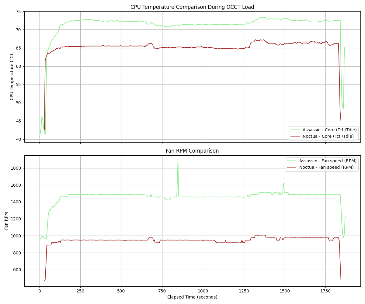 結果はグラフの通り。CPU温度、ファン回転数ともにNoctua NH-D15 G2 LBCの方が優れていることがわかる。
