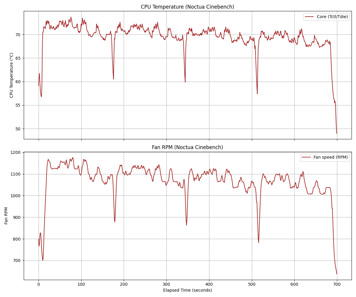 Cinebench 2026を利用したので前回記事とは正確には比べられないが、温度はMax73度ほど、ファン回転数もまだ余裕を残した1200rpm以下(騒音計の読みも55dBほど)で抑えられていた。ついでにスコアは7291でした。
